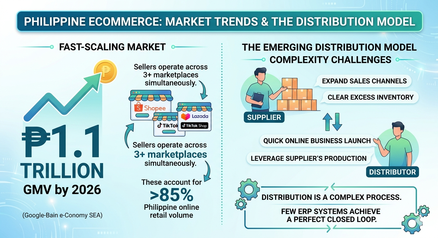 Philippine eCommerce is one of Southeast Asia's fastest-scaling markets, projected to reach ₱1.1 trillion in GMV by 2026 (Google-Bain e-Conomy SEA). Filipino sellers increasingly operate across three or more marketplaces simultaneously — Shopee, Lazada, and TikTok Shop alone account for over 85% of Philippine online retail volume.