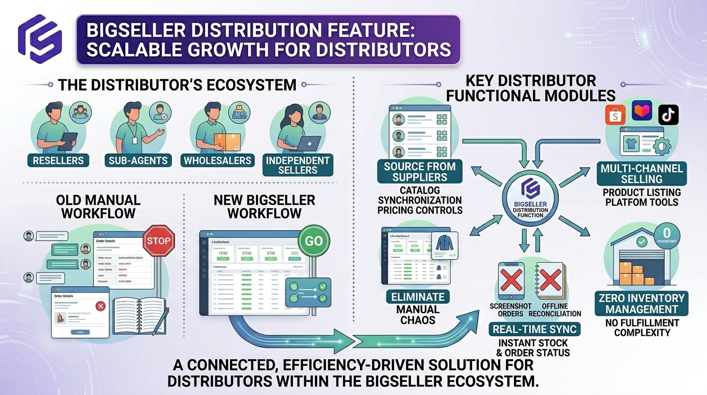 BigSeller's Distribution feature is built for resellers, sub-agents, wholesalers, and independent sellers who want to source products from suppliers and sell them across major e-commerce platforms — without the complexity of managing their own inventory or fulfillment. By connecting distributors directly with suppliers inside the BigSeller ecosystem, the feature eliminates the manual, error-prone workflows of screenshot-based ordering and offline reconciliation.